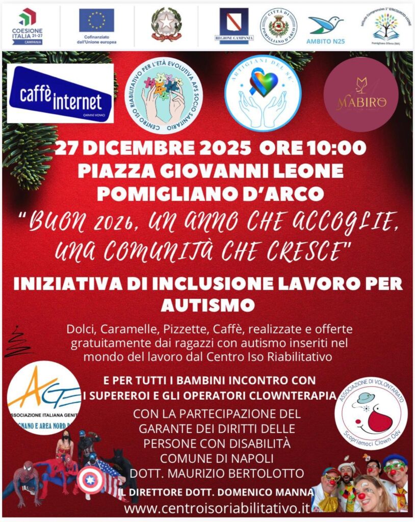 Pomigliano d’Arco, 16 dicembre – Il Centro Iso Riabilitativo del Dott. Domenico Manna e la sua Equipe sono orgogliosi di annunciare un evento speciale dedicato all’inclusione dei bambini e ragazzi con disabilità e autismo, nell’ambito del progetto “Artigiani del Sé”.