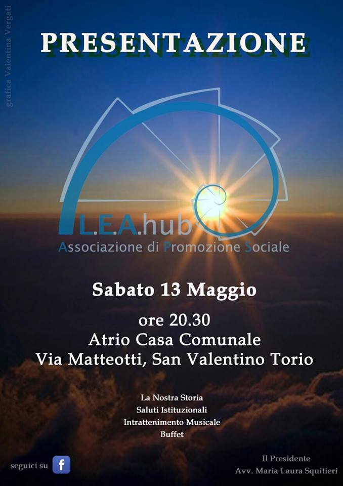Sabato 13 Maggio 2017, alle 20:30, presso l’atrio della Casa Comunale di San Valentino Torio (SA), in via G. Matteotti, si terrà la presentazione ufficiale della neo costituita associazione di promozione sociale L.E.A. hub, che raggruppa un team di lavoro, oramai consolidato, che, nel corso dell’ultimo anno, ha operato sul territorio comunale sanvalentinese mettendo in campo idee innovative e format originali con finalità culturali e di aggregazione sociale.