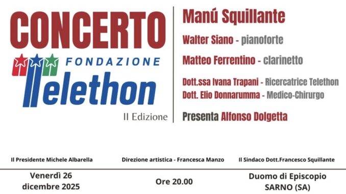 Nel cuore delle festività natalizie, quando la musica diventa linguaggio universale di condivisione e speranza, il Concerto per Telethon – Seconda Edizione si rinnova come appuntamento culturale e solidale di grande valore per il territorio sarnese. Il 26 dicembre 2025, alle ore 20.00, il Duomo di Episcopio accoglierà un pubblico unito da un unico obiettivo: sostenere la ricerca scientifica attraverso la forza dell’arte. L’evento è promosso dal Circolo dell’Amicizia, storica associazione attiva da oltre cinquant’anni, punto di riferimento culturale del territorio e ideatrice dell’Episcopio Teatro Festival, che quest’anno ha celebrato la sua XXX edizione, avviandosi verso il prestigioso traguardo dei sessant’anni di attività nel 2027.