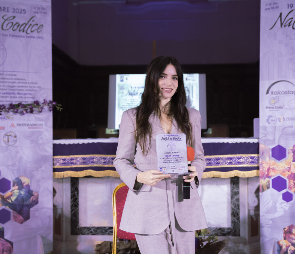 Il Premio Speciale è stato consegnato da Carmine Pelosi, scrittore e giornalista, e dall’artista Sabino Matta, entrambi direttori creativi dell’evento Natale in Codice, tenutosi a Serino il 19 e il 20 dicembre. Un appuntamento che ha assunto un valore simbolico di particolare rilievo, sancendo un gemellaggio artistico con la città di Firenze, nel segno del dialogo tra territori, visioni e linguaggi contemporanei. A rendere ancora più significativa la cerimonia, la presenza di una madrina d’eccezione: Aurora Ruffino, che con sensibilità e partecipazione ha accompagnato un momento capace di unire racconto, arte e responsabilità culturale, rafforzando il senso profondo di un riconoscimento nato dall’incontro tra persone, luoghi e idee.