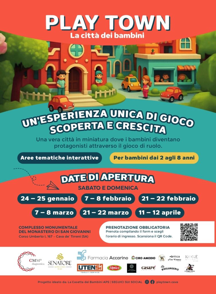 L’iniziativa si terrà dal 24 gennaio all’11 aprile, presso il Complesso Monumentale del Monastero di San Giovanni a Cava dei Tirreni, in provincia di Salerno. Play Town propone una città in miniatura dove i bambini, attraverso il gioco di ruolo, possono sperimentare ruoli, servizi e ambienti della vita quotidiana in modo attivo, sicuro e altamente educativo.