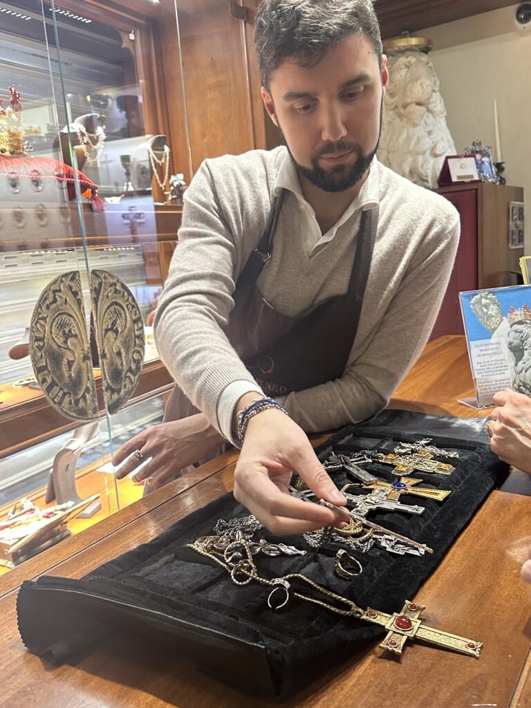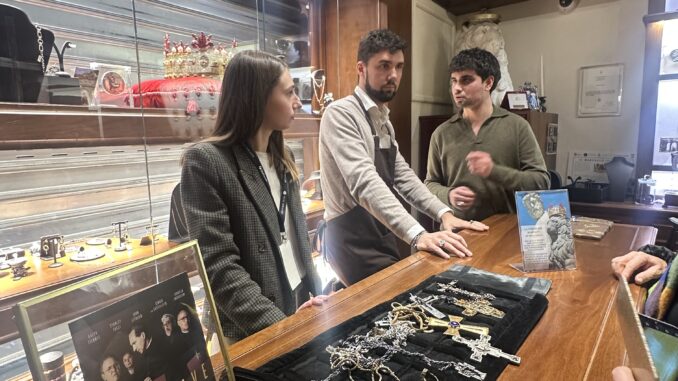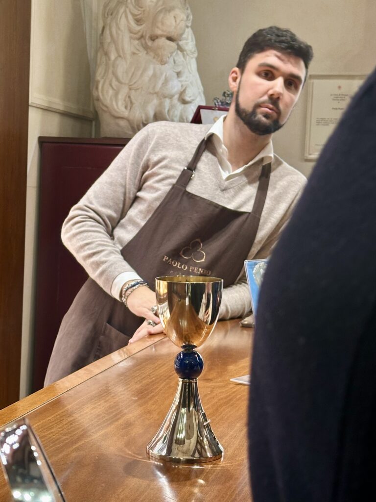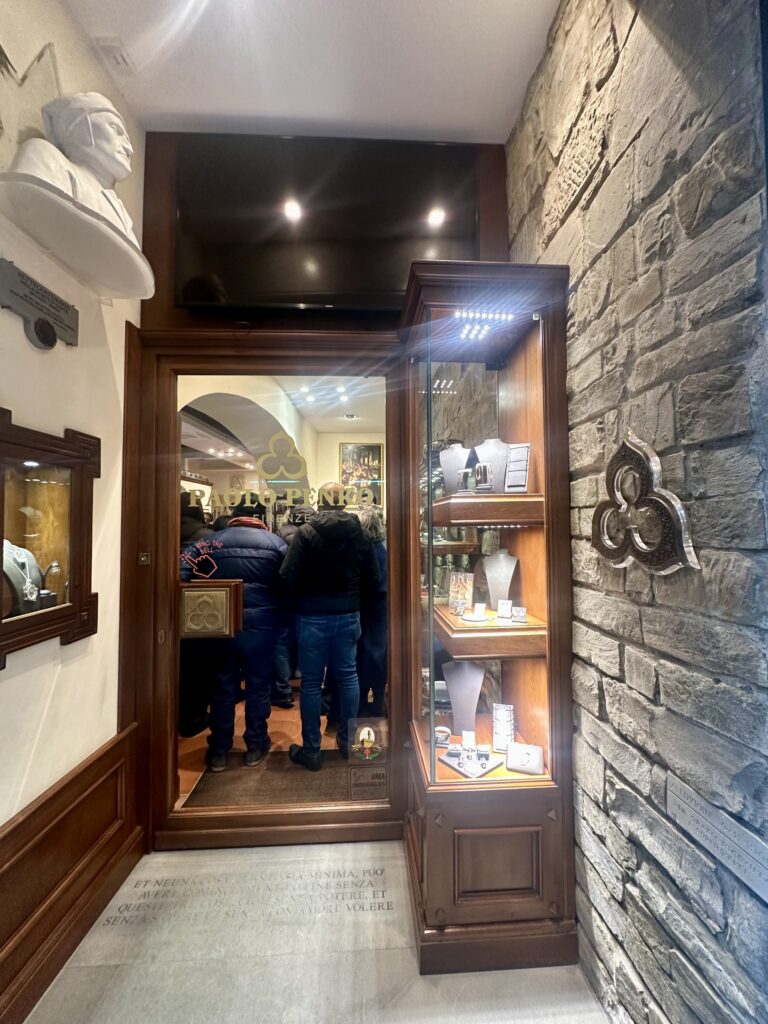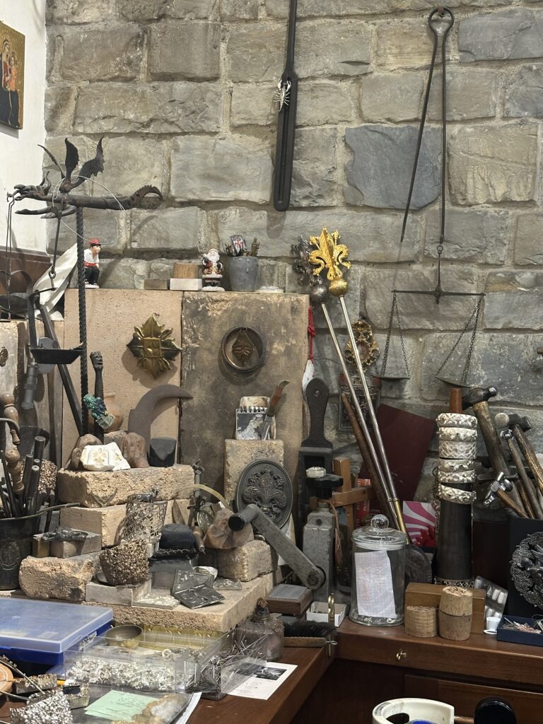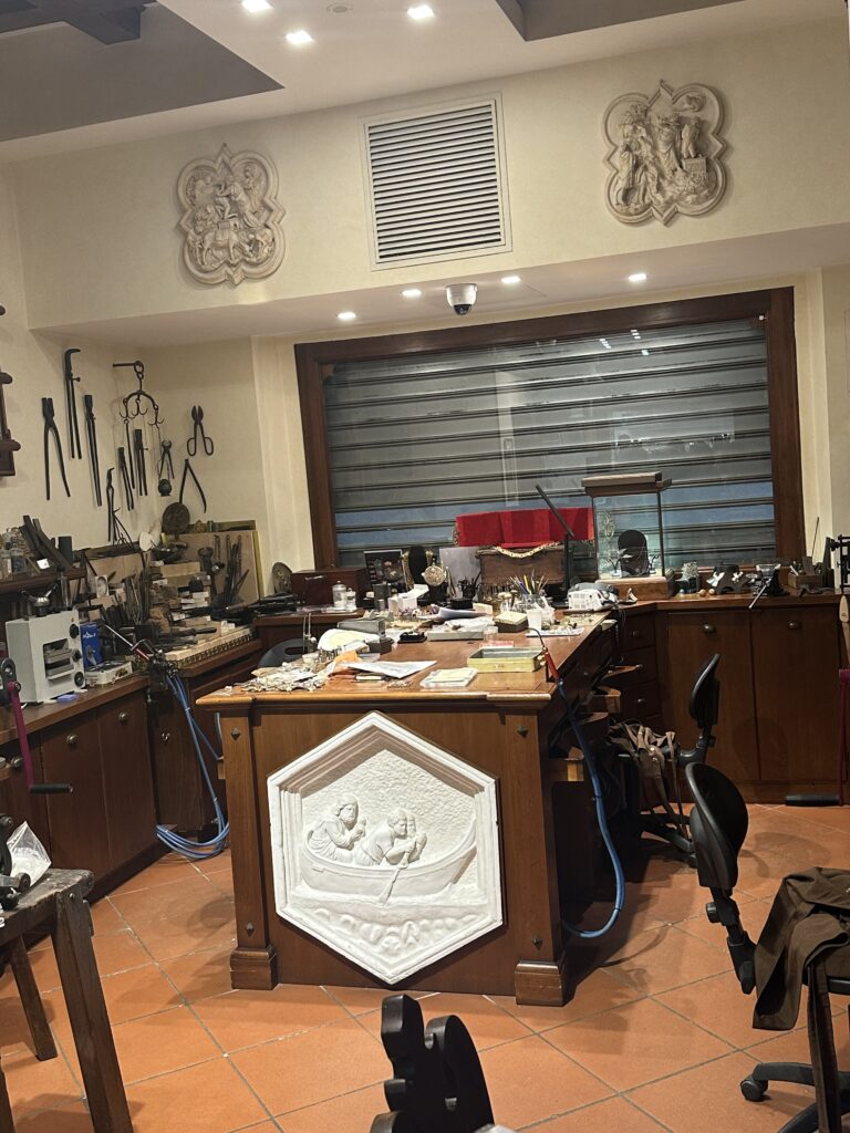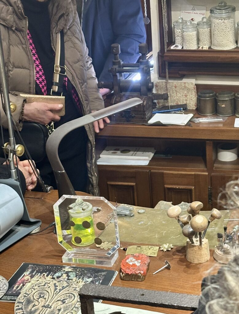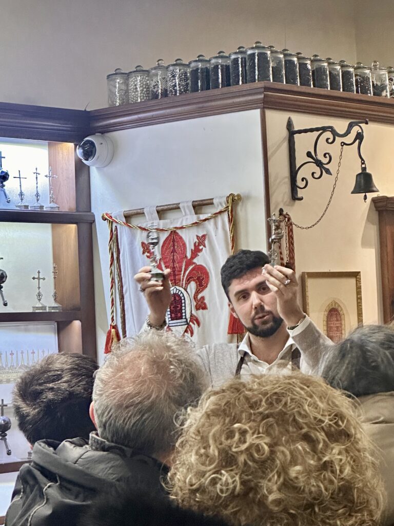Ad accogliere la visita esclusiva di domenica è proprio Alessandro Penko che, con simpatia, competenza e una naturale capacità narrativa, guida gli ospiti all’interno della bottega, accompagnandoli in un percorso fatto di gesti, strumenti, simboli e storie. Un racconto arricchito dal supporto della guida Irene Casini, capace di contestualizzare ogni passaggio con eleganza e precisione, restituendo profondità storica e valore culturale all’esperienza.