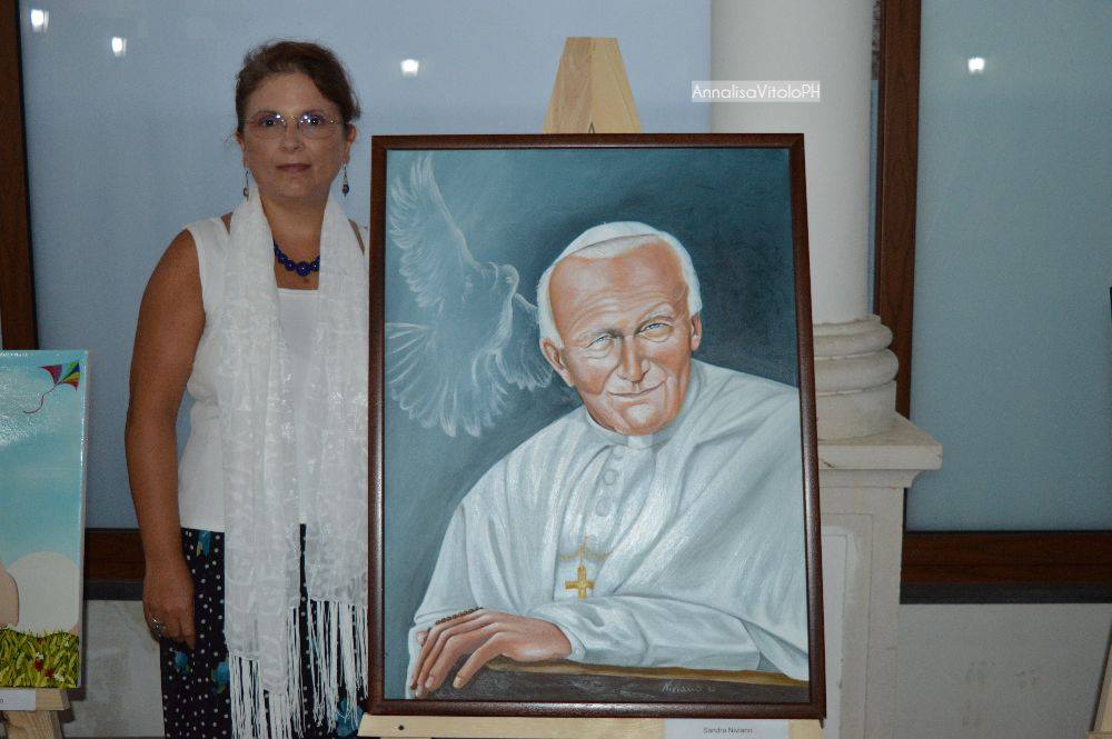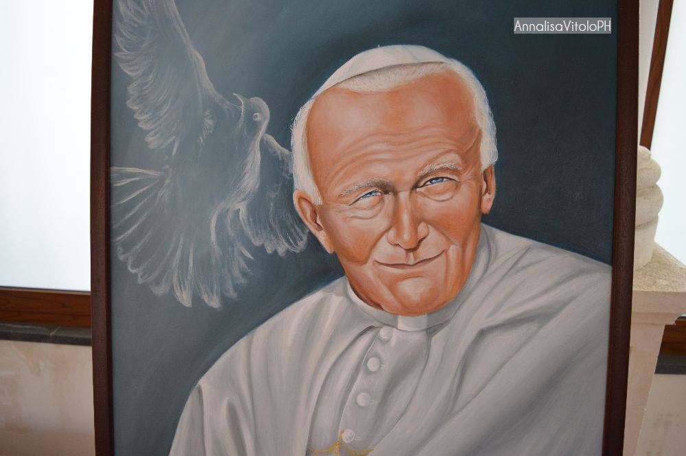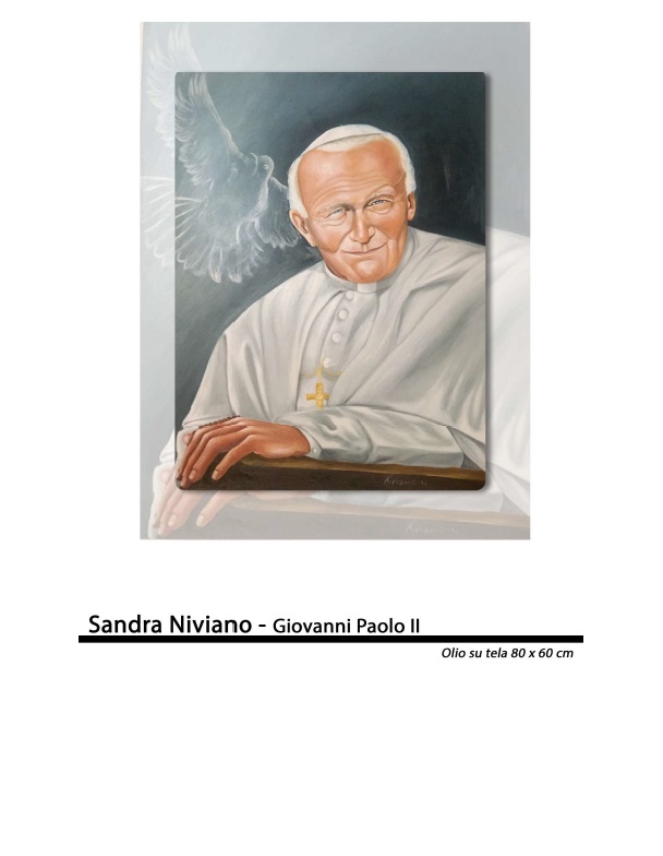 La mia opera è un omaggio ad un grande uomo venuto da lontano, è un olio su tela di 80×60 cm Intitolata: Papa Giovanni Paolo II. La tela ritrae la sua figura in uno sguardo attento su uno sfondo azzurro dove vola una colomba bianca, simbolo di pace. Egli è stato il Papa che hanno amato tutti per la sua semplicità e colui che portò il cambiamento nella Chiesa, una Chiesa vista allora molto distante, aprendo il dialogo tra le religioni. Con la sua simpatia e naturalezza si è avvicinato di più alla gente, specialmente ai giovani diffondendo valori importanti come : pace, amore e perdono. Lui perdonò il suo attentatore e questo fù un grande insegnamento per tutti noi. Papa Giovanni Paolo II fu una grande figura carismatica che ha fatto la storia, un grande uomo di pace.