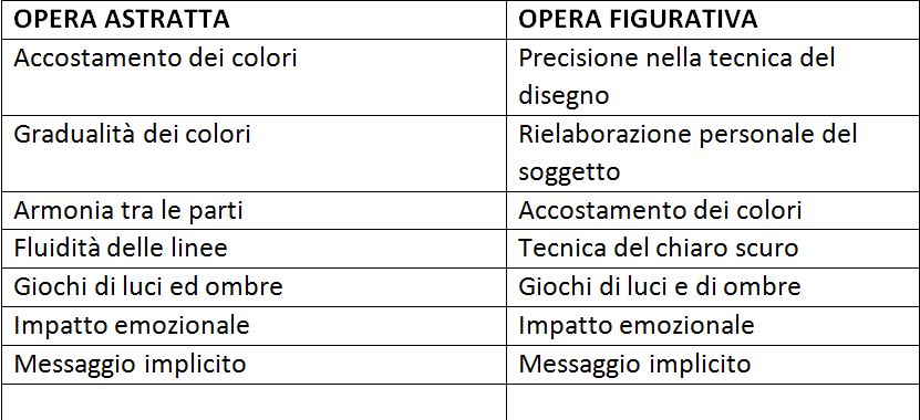 Rispondere a questa domanda, mi crea un certo disagio, perché non sono un’esperta in materia e le cose che dico sono personali ed opinabili e fanno parte del mio pensiero in proposito. Penso che per la valutazione di un’opera occorrano dei criteri di base differenti a seconda che si tratti di un’opera astratta o figurativa. Tra i possibili criteri potrebbero rientrare i seguenti: