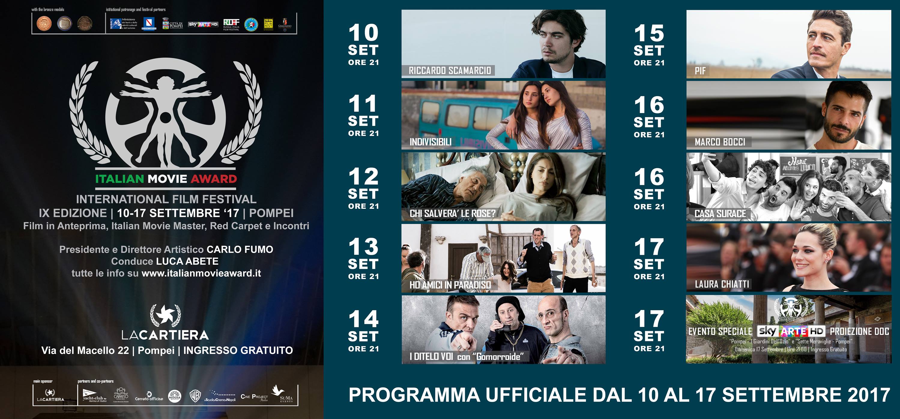 PROGRAMMA UFFICIALE ITALIAN MOVIE AWARD ® | IX EDIZIONE 2017 – Domenica 10 settembre, alle ore 21:00, apertura del Festival con il premio a Riccardo Scamarcio e la proiezione del film “John Wick – Capitolo 2” che vede l’attore pugliese tra i protagonisti. – Lunedì 11 settembre: serata in compagnia del Presidente della Giuria Paolo Chiariello per visionare i 5 corti in nomination nella Short Social World Competition di questa edizione. Al termine, proiezione del film “Indivisibili” di Edoardo De Angelis, vincitore del premio come “Miglior Film”. – Martedì 12 settembre: in mattinata, lezione dell’Italian Movie Master con lo sceneggiatore Francesco Uccello. In serata, sarà, poi, consegnato il premio “Roots” al film “Chi Salverà Le Rose?” di Cesare Furesi: sarà presente Giulio Cesare Senatore, produttore del film. – Mercoledì 13 settembre: in mattinata, lezione dell’Italian Movie Master con l’autore e scrittore Virgino de Maio che presenterà il suo libro “Filmmaster”. In serata, sarà la volta del Premio “Sociale” al film “Ho Amici in Paradiso” di Fabrizio Maria Cortese, con la presenza del regista. – Giovedì 14 settembre: serata dedicata alla distribuzione indipendente campana, capace di ottenere grandi risultati al botteghino. Proiezione del film “Gomorroide”, con la presenza del cast de “I Ditelo Voi”; sarà consegnato il premio al produttore Nando Mormone per “Tunnel Produzioni”. – Venerdì 15 settembre: di sera, sarà consegnato il Premio a PIF, regista, attore e conduttore. Per omaggiarlo, sarà proiettato il suo primo grande successo da regista: “La Mafia Uccide Solo D’Estate”. – Sabato 16 settembre: la serata si aprirà con il Premio ai ragazzi di Casa Surace per la campagna web “I Film Famosi al Sud”, realizzata per Anica e Cinè. Grande attesa per l’arrivo dell’attore Marco Bocci. In conclusione, la proiezione del film campione d’incassi “L’Ora Legale” di Ficarra e Picone. – Domenica 17 settembre: serata di chiusura dedicata a SkyArteHD, con la premiazione del Direttore Roberto Pisoni, per la produzione dei documentari “Pompei – I Giardini Dell’Ozio” e “Sette Meraviglie – Pompei” che verranno proiettati in esclusiva al termine della serata. Saluti del Sindaco di Pompei Pietro Amitrano e breve dibattito sul tema del Festival in relazione alla Città di Pompei, in compagnia del giornalista di SkyTg24 Paolo Chiariello. Al termine, arriverà sul red carpet dell’Italian Movie Award una tra le più belle e brave attrici del cinema italiano, Laura Chiatti, premiata per “1992 – La Serie”.