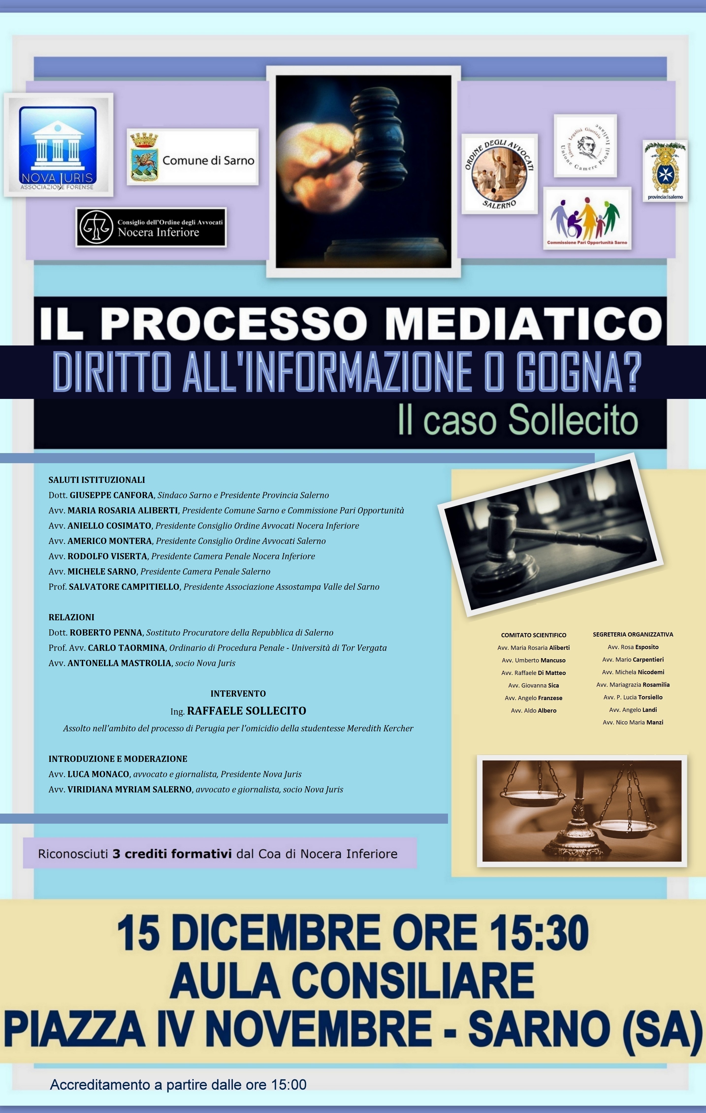 Il Processo mediatico: diritto all’informazione o gogna? Si terrà a Sarno, presso l’Aula consiliare del Palazzo municipale, venerdì 15 dicembre, ore 15:00, l’interessantissimo Convegno su un tema di scottante attualità. Un dibattito che prevede 3 crediti formativi per gli Avvocati ma che è aperto a tutti; anzi, si auspica anche la presenza di non addetti ai lavori che abbiano voglia di confrontarsi su questo appassionante argomento.