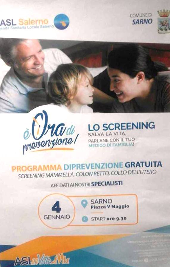 A Sarno, il 4 gennaio 2018, dalle ore 9.00 alle ore 18.00, su iniziativa del Distretto Sanitario n. 62 Sarno/Pagani (Direttore Responsabile: Dott. Antonio Russo), riparte “AslinVita – È ora di Prevenzione”, la campagna itinerante di prevenzione gratuita.