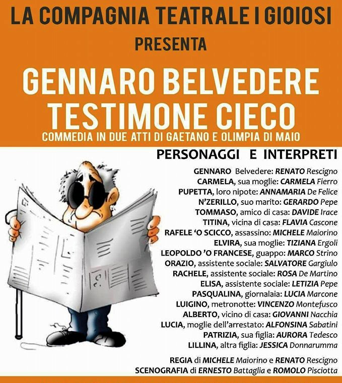 Sabato 5 maggio 2018, al Teatro Auditorium S. Alfonso Maria De’ Liguori di Pagani, è andato in scena l’ultimo appuntamento con la Rassegna teatrale prima della pausa estiva. Lo spettacolo in programma era una riproposizione di una commedia scritta, a quattro mani, da Olimpia e Gaetano di Maio nel 1985. Il titolo della commedia: Gennaro Belvedere – Il Testimone cieco.