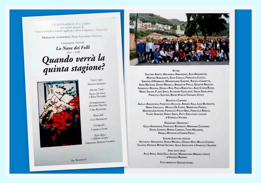 In una location sicuramente affascinante, quale l’Atrio del Palazzo Buchy di Sarno, pregno di storia e di arte, si è squadernata, come in un magico caleidoscopio, la drammatizzazione dello Spettacolo della Compagnia teatrale “La Nave dei Folli”, dal suggestivo titolo “Quando verrà la quinta stagione?”, con cui il Liceo Classico Scientifico, Linguistico e delle Scienze applicate “T. L. Caro”, magistralmente guidato dal Dirigente Scolastico prof. Giuseppe Vastola, ha presentato, il 5 giugno, per il ventiseiesimo anno, una produzione originale del Liceo. Con questa Opera teatrale si completa la trilogia sul docu-teatro: essa ha avuto inizio con “Questa terra è anche la tua terra” sul tema dell’immigrazione; poi con “I volti dell’Altro” ha trattato le persecuzioni subìte dagli umiliati e dagli offesi e ha incardinato quest’ultimo lavoro sulla lotta fra Violenza e Ragione, fra democrazia e dittatura del Web, vittima della quale è stata, tra gli altri, Tiziana Cantone, un caso vero di tragica cronaca, che graffia il cuore e l’anima. Su questi temi “La Nave dei Folli” può vantare una primogenitura tematica e linguistica, in quanto li ha affrontati, con grandissimo successo, da vari anni, sì da diventare nel tempo un piccolo-grande modello rappresentativo.