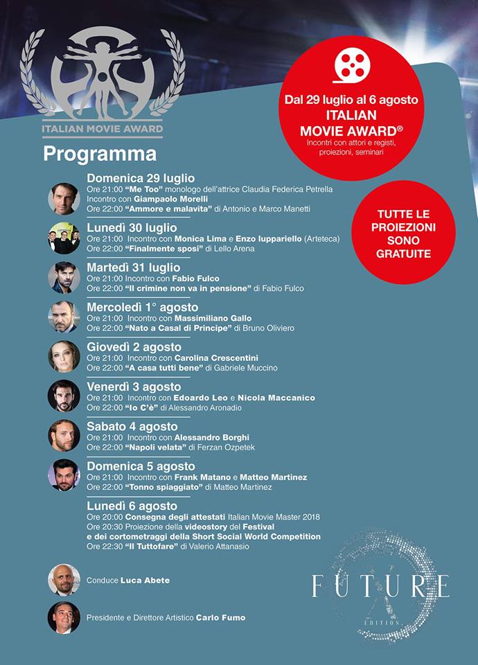 Il 6 agosto, serata conclusiva con la consegna degli attestati all’Italian Movie Master; vi sarà poi la proiezione della videostory del Festival e dei cortometraggi della Short Social World Competition. Per concludere, il film ‘Il Tuttofare’ di Valerio Attanasio.