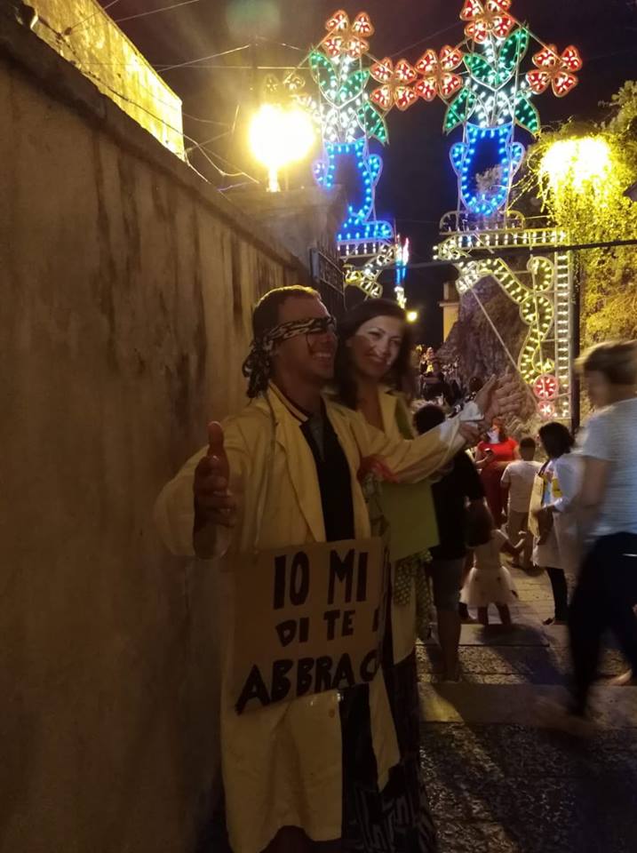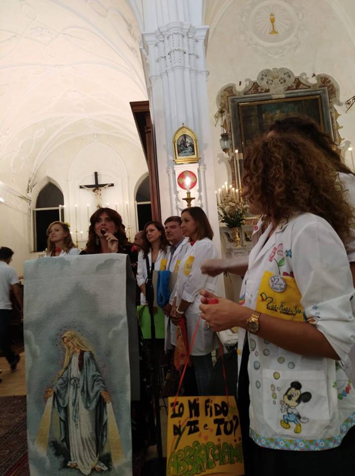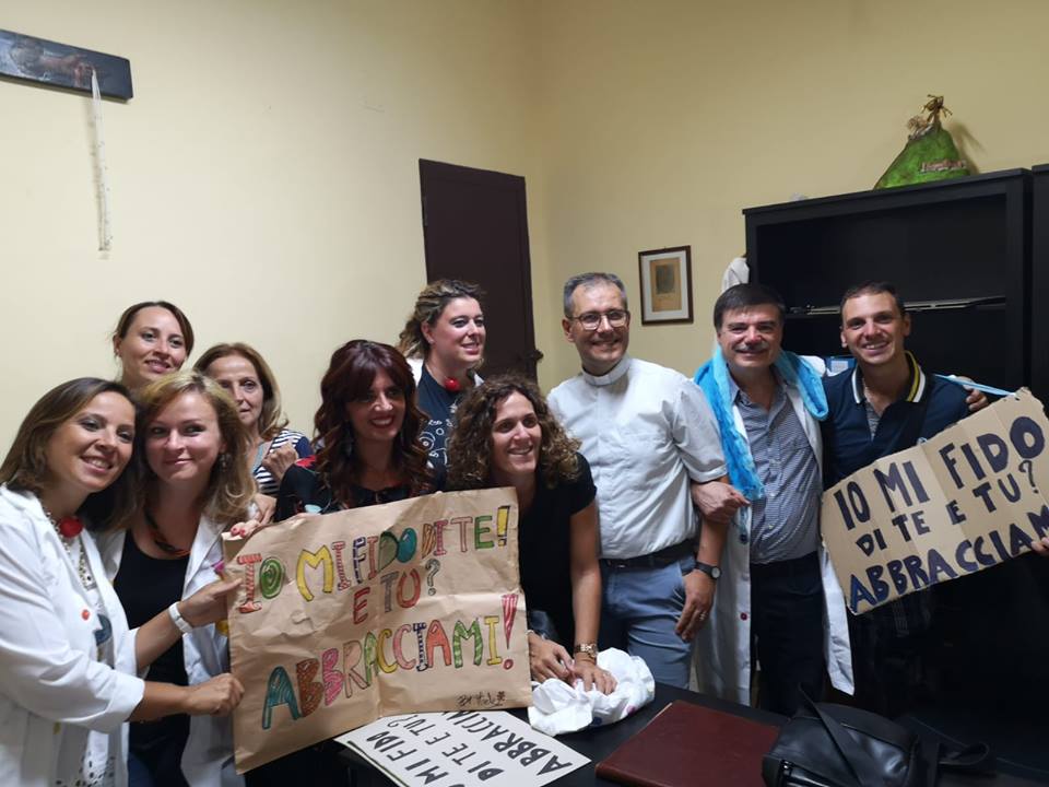 don Roberto Farruggio, Parroco attivissimo, sensibile e colto, ha preso la parola la Sociologa Francesca Colombo, Presidente dell’Ass. “Nasi rossi Clown Therapy”, la quale ha spiegato che l’Associazione ha fatto della “clownterapia” la mission della propria attività, ispirata al motto “Un cuore allegro fa bene come una medicina”. E ha proposto che all’uscita dalla Chiesa i devoti, presenti in foltissimo numero, abbracciassero i componenti dei “Nasi rossi” che li aspettavano a braccia aperte. Un abbraccio -questo era il senso dell’esperimento terapeutico- è non solo un bel gesto di affetto, amicizia e solidarietà, ma anche un momento in cui si crea in coloro che si stringono in abbraccio una sorta di “magnetismo” rigeneratore, che ha come effetto il benessere del corpo e della mente, del cuore e dell’animo.