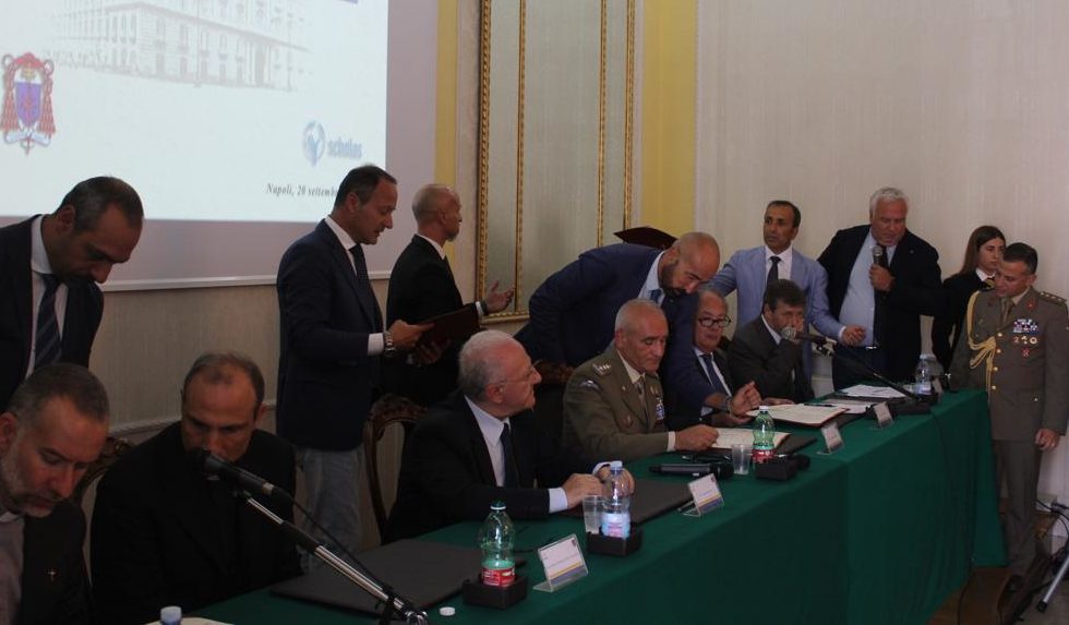 L’accordo è stato siglato tra il Comando delle Forze Armate Operative Sud, la Regione Campania, l’Arcidiocesi di Napoli e la Fondazione Pontificia Scholas Occurrentes. Sono intervenuti tra gli altri il Generale di Corpo d’Armata Rosario Castellano ed il Presidente della Regione Campania Vincenzo De Luca.