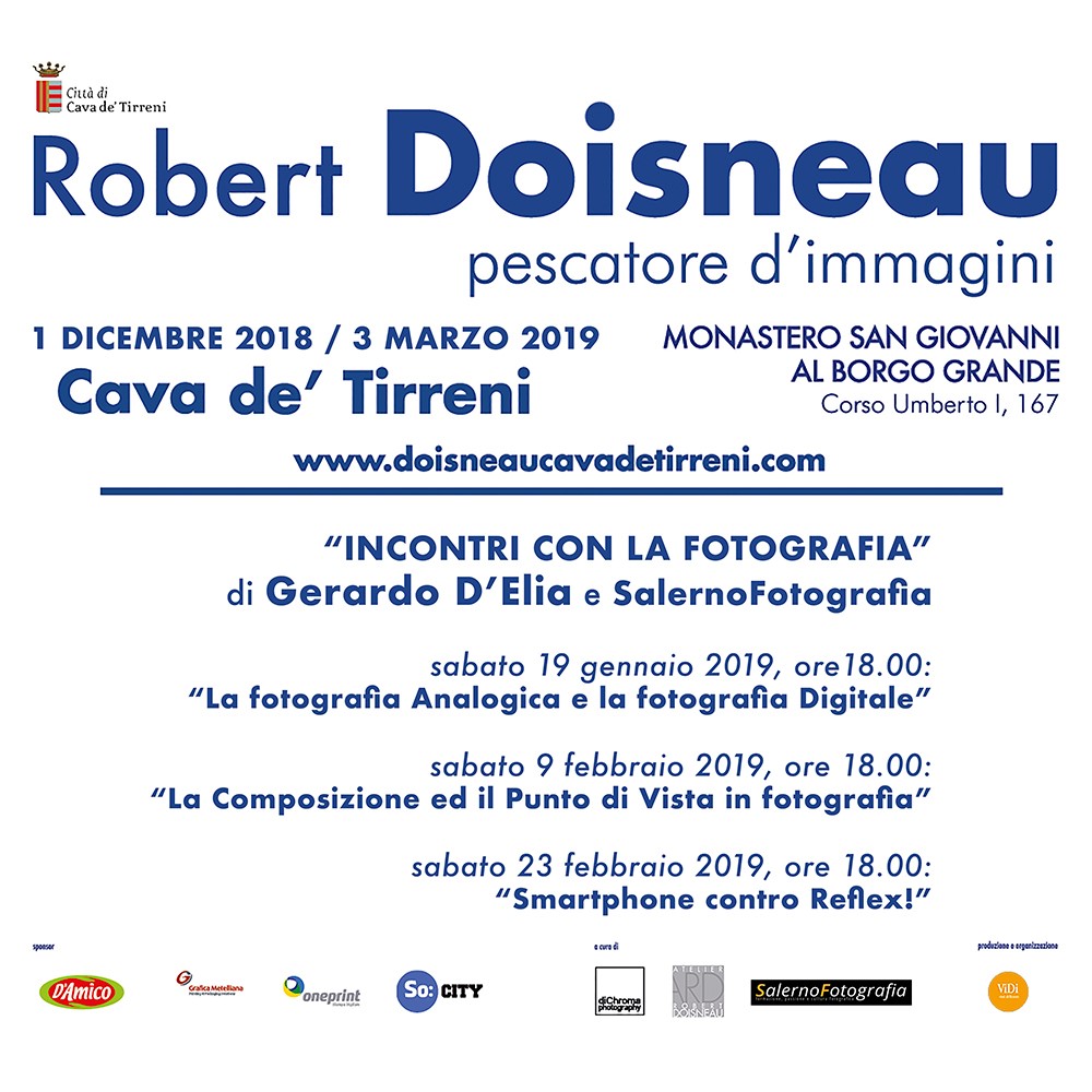 Dal 1 dicembre è possibile visitare la mostra dedicata al famosissimo fotografo francese “Robert Doisneau -Pescatore d’immagini”, presso il rinnovato spazio del Complesso monumentale di San Giovanni Battista al Borgo Grande – Cava de’ Tirreni (SA). L’esposizione, curata da Francine Deroudille e Annette Dosineau, dell’Atelier R. Doisneau, sarà visitabile fino al 3 marzo 2019. Essa, divisa in sezioni, ci presenta l’elemento comune di una quotidianità in bianco e nero: scatti casuali di persone più o meno involontariamente in posa.