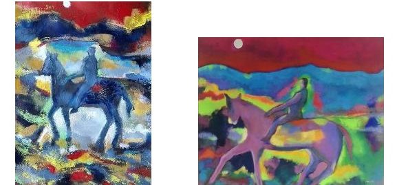 Altre due opere presentano cavalieri che vanno alla ventura, lungo la traiettoria e il cavaliere del sole: colori accesi accompagnano il lento avanzare di un cavaliere blu su un animale ibrido (un misto tra bue e cavallo) e sotto un sole pallido; e ancora in attesa della luce, dove un cavaliere sta fermo sopra un quadrupede, aspettando che la terra finisca di illuminarsi sotto un sole giallo con i colori giallo, rosso e blu, per potere proseguire l’avventura.