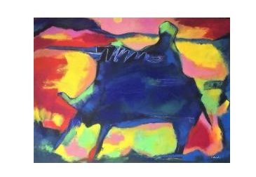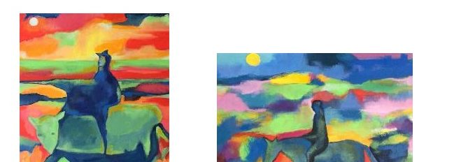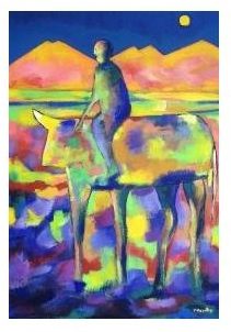 Con la loro gioia di vivere, con la serenità, con l’amore, ma anche con la loro tristezza o malinconia, ci aprono uno spazio vitale, prima che arrivi il The after Day, il giorno della fine del mondo o del nostro pianeta, allorché l’uomo – ricurvo su un animale amorfo – si piega su stesso e non riesce più a guardare il cielo, e neppure l’orizzonte. La terra è infuocata, il cielo è tetro, buio, dove fa capolino soltanto un astro bianco.