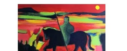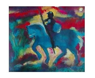 Non poteva neppure mancare il cavaliere ardimentoso, don Chisciotte, l’eroe che va a combattere contro i mulini a vento, scambiandoli per i suoi nemici. Il cavallo possente azzurro avanza con passo maestoso, portando il cavaliere che guarda avanti con sguardo sicuro. Nel secondo lavoro che porta il titolo di don Chisciotte il cavallo scuro, reggendo sulla groppa il cavaliere, chiuso nella sua armatura, avanza ritmicamente all’impresa tra un paesaggio luminoso di giallo e rosso fuoco. Nel rantolo della terra il cavaliere, con un cavallo che sta per impennarsi, tende avanti a sé la spada, mentre è seguito da una mezza-figura, che potrebbe rappresentare il suo servitore Sancio Panza. L’autore ha voluto descriverci scene baldanzose, quanto insignificanti, come è stata la lotta contro le false immaginazioni degli uomini: il male non si può sconfiggere soltanto con le nostre forze.