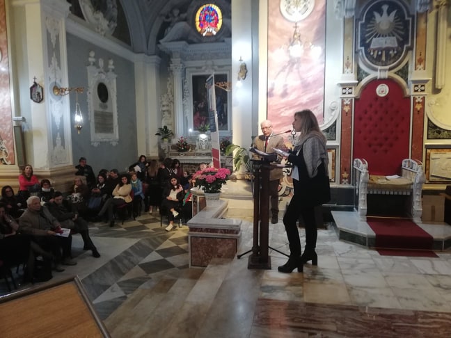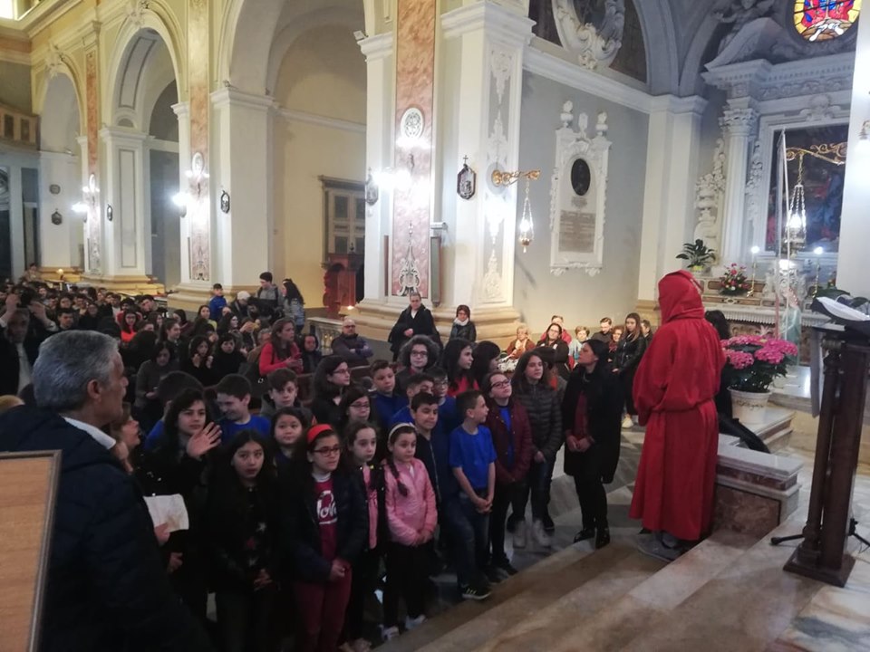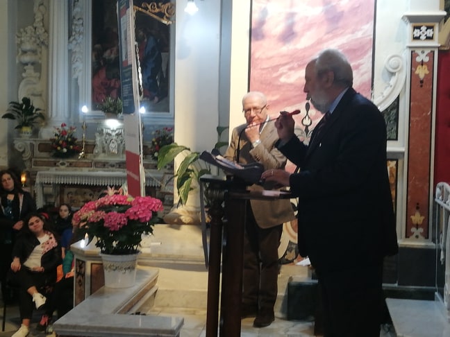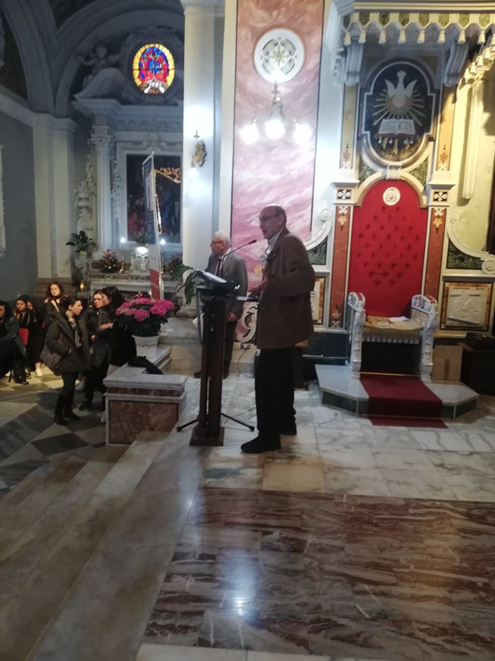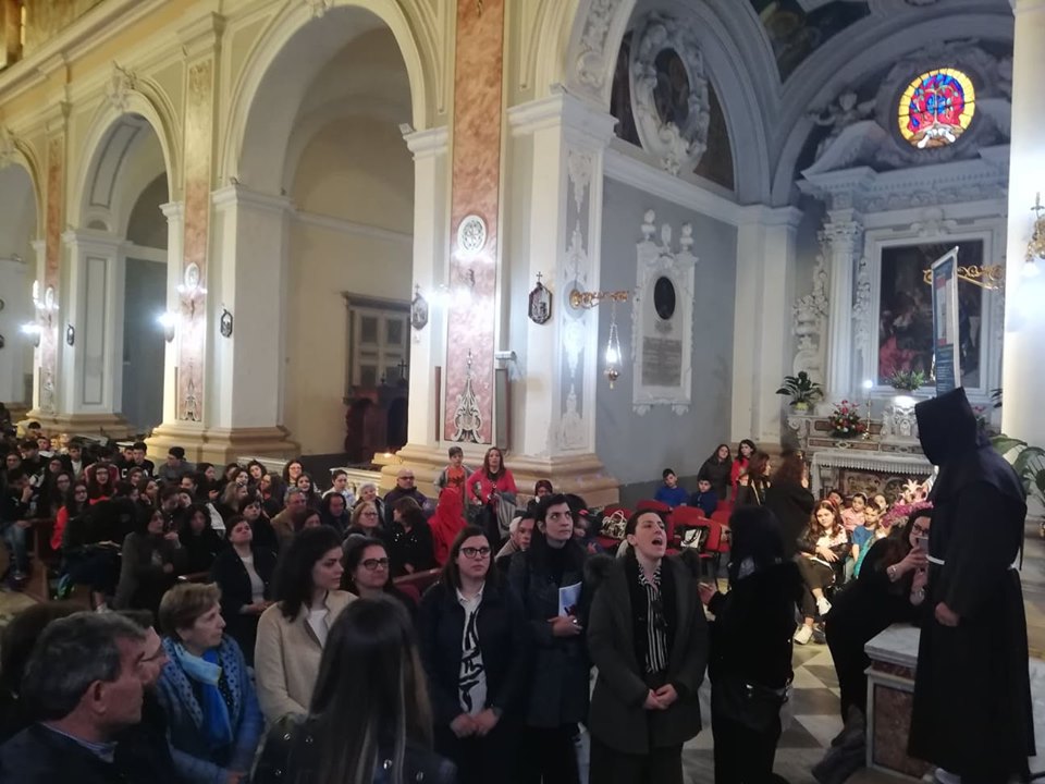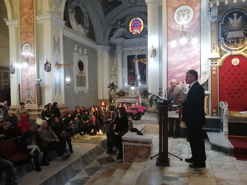 Poi si entra direttamente nel cuore dell’Evento, facendo risuonare nelle volte del Tempio il toccante canto “Ecco la bella Croce”, eseguito dai Cantori della Confraternita di S. Matteo. La Croce, che è il simbolo della Pasqua, è definita “bella”, in quanto è la “chiave che ci apre le porte del Cielo, chiuse” a causa del peccato. Il canto è stato seguìto dal commento alla sua parola-chiave, che è appunto “Croce”, commento pubblicato nel libro e letto da una studentessa della classe V B del Liceo Classico (coordinata dalla Prof.ssa Teresa Donnarumma). L’altra classe che ha scritto le riflessioni (anch’esse pubblicate nel libro) è la V B del Liceo Scientifico (coordinata dalla Prof.ssa Anna Cristina Crescenzi). E in tal modo la Manifestazione (che si avvale del prestigioso Patrocinio morale della “Federazione italiana Tradizioni popolari”) ha alternato gli interventi di Ospiti ai canti delle Croci, seguiti dai commenti creativi degli studenti. Un’operazione, questa, mai tentata finora, che dà spessore culturale al Progetto di alternanza Scuola-Lavoro, i cui Esperti sono gli Autori del libro e i cui referenti sono la Prof.ssa Anna Cristina Crescenzi e il prof. Francesco Ronga.
