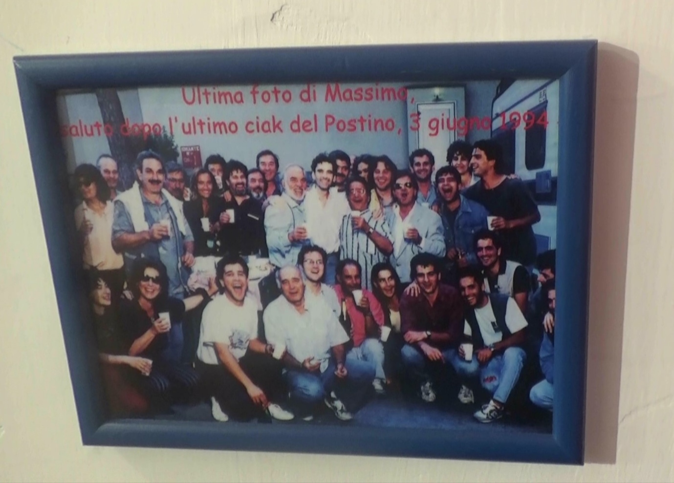 Sulla parete, una foto mostrataci dal fratello: Massimo immortalato solamente 24 ore prima della sua scomparsa con il gruppo del cast del film. Si congedò da loro con la frase: “Non dimenticatevi di me”. Con “Il Postino” ottenne un riconoscimento a metà, la nomination all’Oscar come miglior attore protagonista.