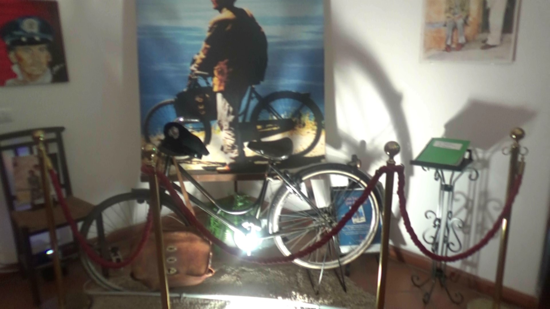 Immancabile, e non poteva essere altrimenti, la bicicletta usata dal personaggio di Mario Ruoppolo, con il berretto e la borsa posati sul manubrio. Di lato, il copione tratto dal romanzo dello scrittore cileno Antonio Skàrmeta: ‘Ardente Paciencia’, tradotto in italiano ne ‘Il postino di Pablo Neruda’.
