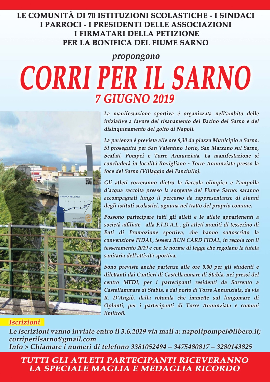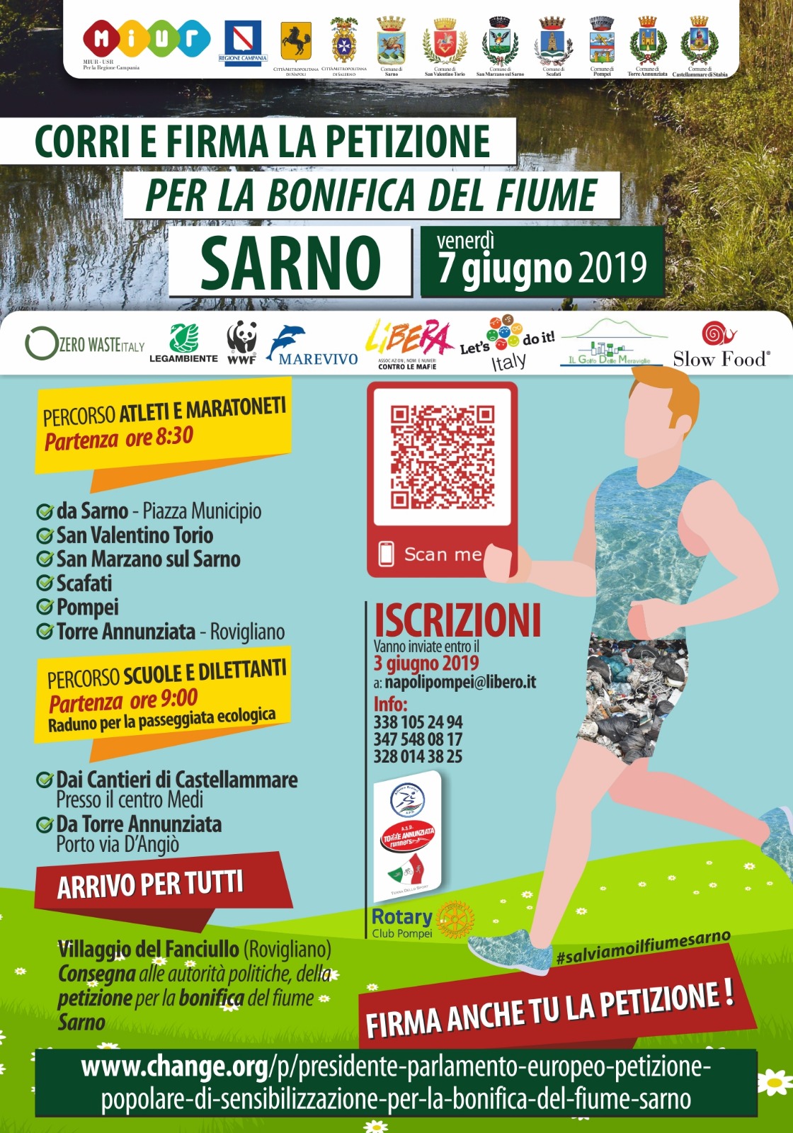 Queste le motivazioni che sono a monte della grande Manifestazione sportiva “Corri per il Sarno”, che si terrà il 7 giugno. Organizzatori: le Comunità di 70 Istituzioni scolastiche, i Sindaci e i Parroci, i Presidenti delle Associazioni, i firmatari della petizione per la bonifica del fiume Sarno.